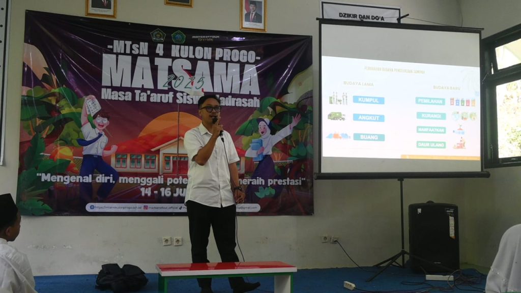 Kulon Progo (MTsN 4 Kulon Progo) Hari ketiga Matsama, MTsN 4 Kulon Progo hadirkan narasumber Dinas Lingkungan Hidup Kabupaten Kulon Progo Muhammad Fauzy ST guna memberikan bekal kepada siswa kelas VII untuk memulai peduli sampah, Rabu (16/7/2025). Acara tersebut diikuti oleh seluruh peserta Matsama 2025.